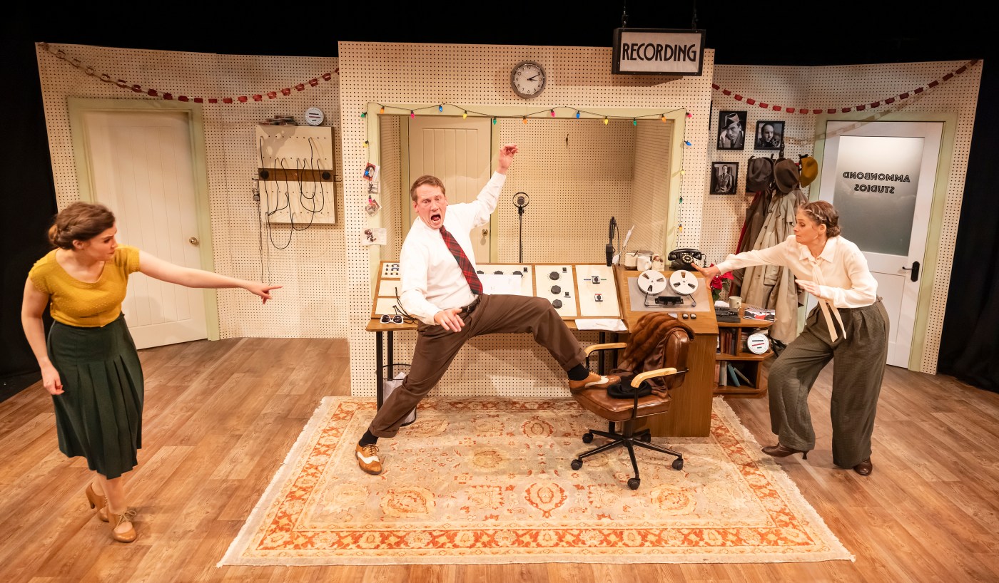 Set in a recording studio for a popular radio drama, siblings Dorothy Richards (Kirsty Cox) and Herbert Richards (Stuart Tavendale) have to quickly improvise when their producer Wyllis Guthrie (Mark Collier) unexpectedly turns up at the station which threatens to uncover the station hasn’t employed and paid for a a full cast, instead Hebert is doing all of the roles and receiving five lots of wages for it.